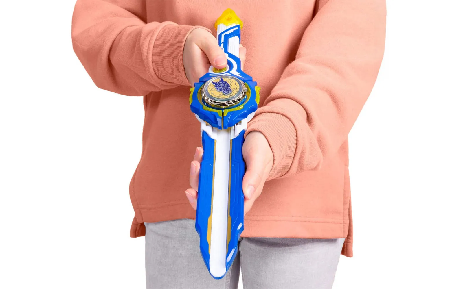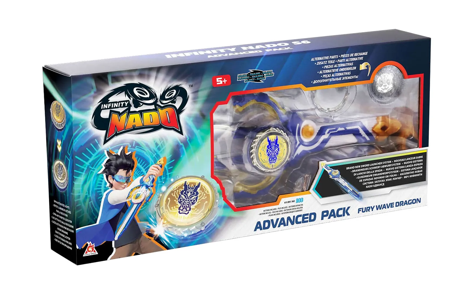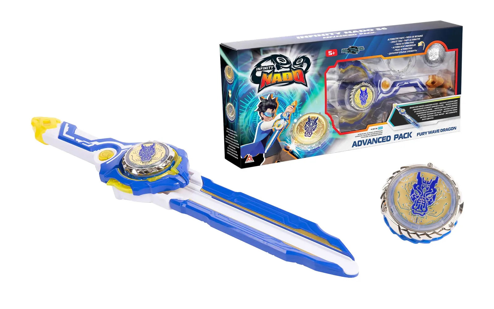 Become unstoppable with the Infinity Nado Advanced Pack - Fury Wave Dragon and discover a whole new system on the launch sword. The sword gives battle power and speed to win all duels! Simply insert the top of the Nada into the launch pad on the sword, pull back and forth to accelerate - the Nado will automatically light up as you spin, then press the trigger on the handle, aim and fire to start an epic showdown with your friends. This unique toy will not only win children's hearts, but also allow them to experience competitive play, improve their motor skills, develop patience and develop a sense of fair competition. Set includes: Epic Launcher Advance sword, shiny metal Nado spinner, additional avatar and metal ring, assembly tool. The toy runs on 6x LR41 batteries, which are included. The toy is suitable for children from 5 years of age.