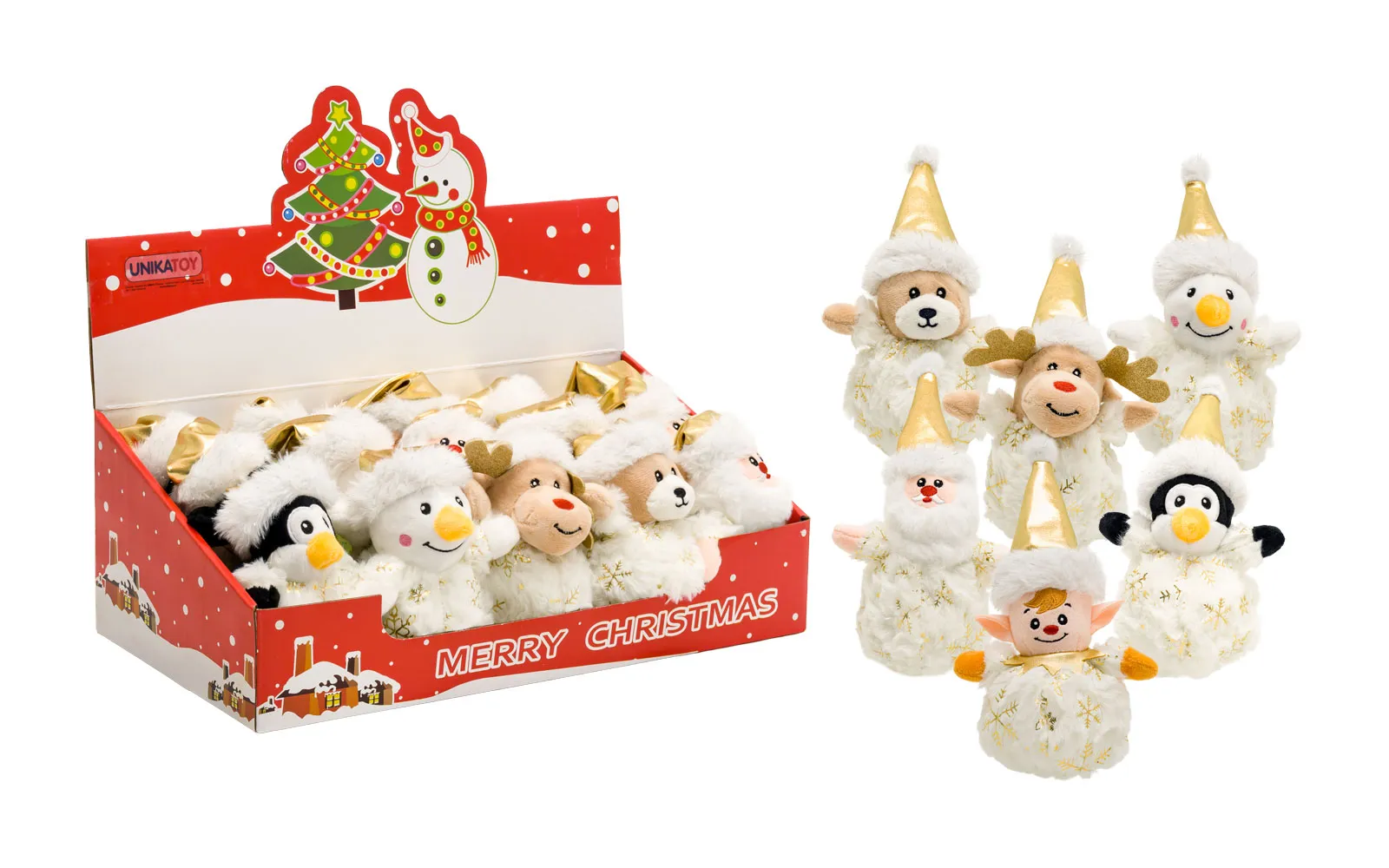The plush Christmas figurines are 12 centimeters in size and white in color. They have warm hats and wonderful gold details that give them a festive glow. They are exceptionally soft to the touch, making them perfect companions for winter days and a wonderful decoration for your home! Available in various styles - teddy bear, reindeer, snowman, Santa Claus, penguin and elf.