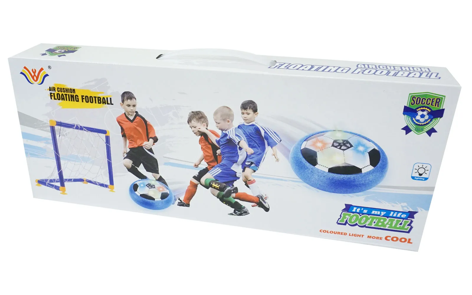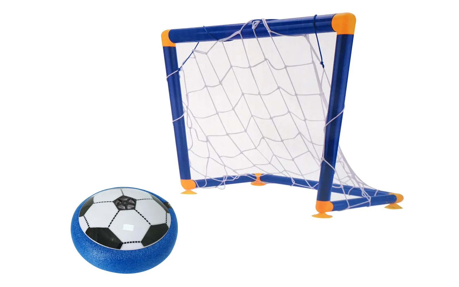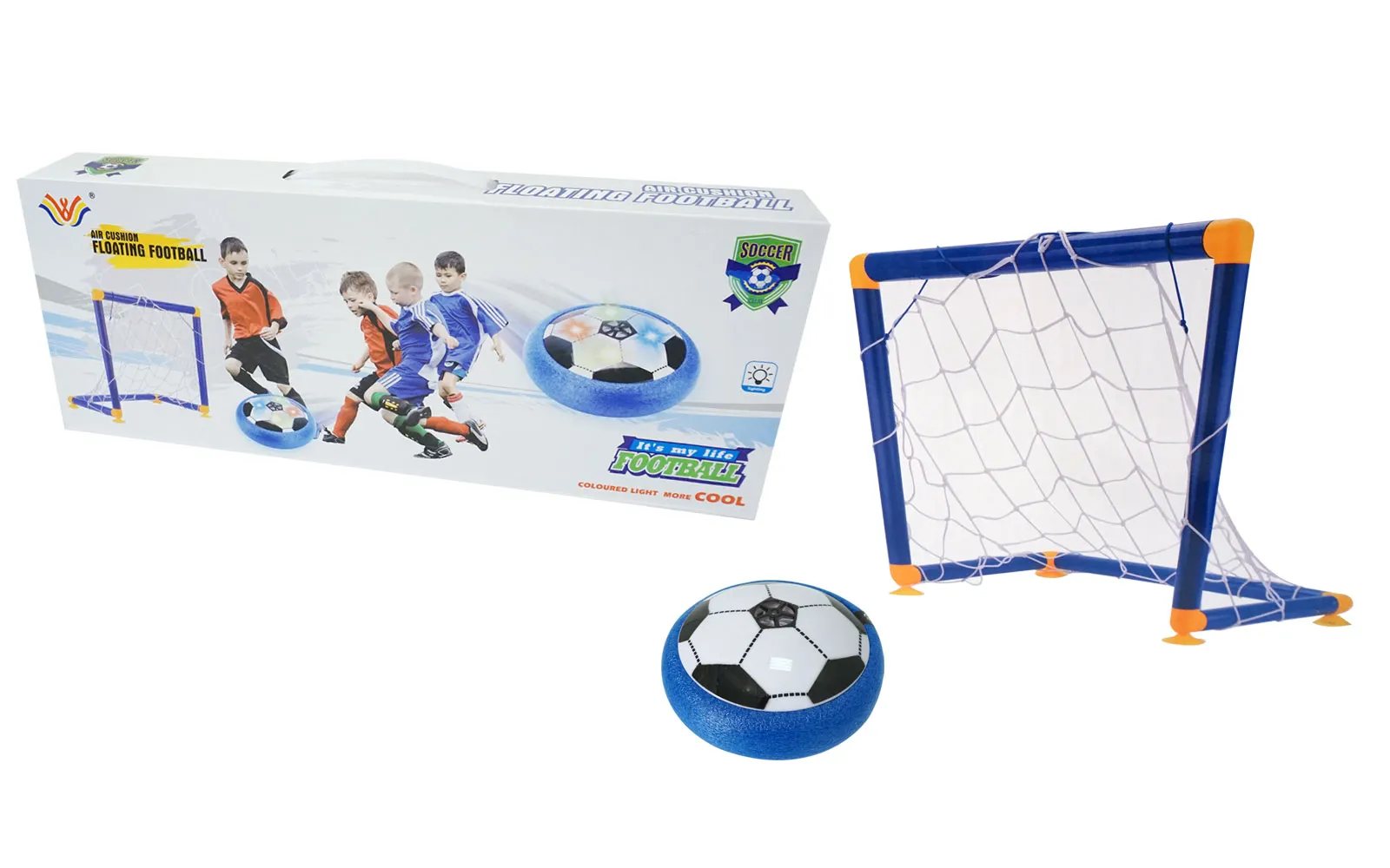 The set includes a goal with a net and a battery-operated ball with a diameter of 14 cm, which you turn on by moving the on\/off button to the on position, located on the bottom of the ball. Flashing colored lights will light up, and the ball will start to move by itself. Accelerate its movement by pushing it with your foot. Use the ball on smooth, flat surfaces. It requires 3 AA 1.5 V batteries - batteries are not included. The goal posts and connectors are made of PVC material. The dimensions of the goal are: length 50 cm, width 26 cm, and height 38 cm.