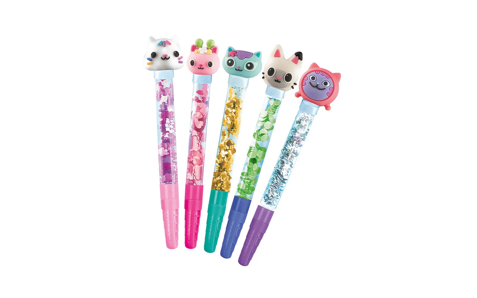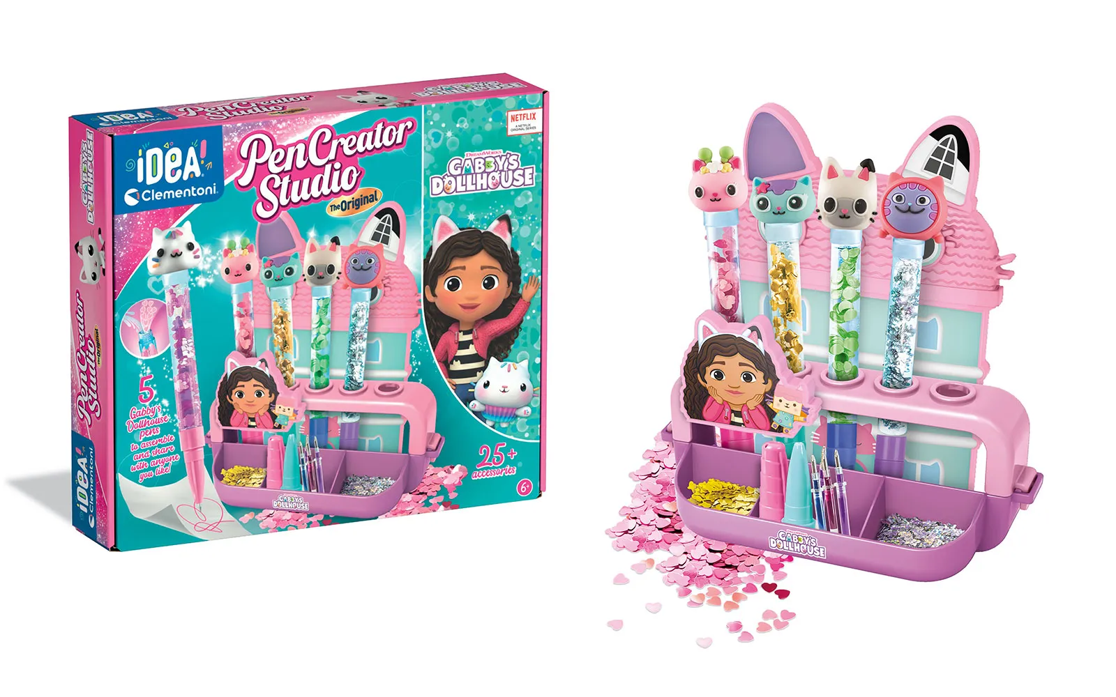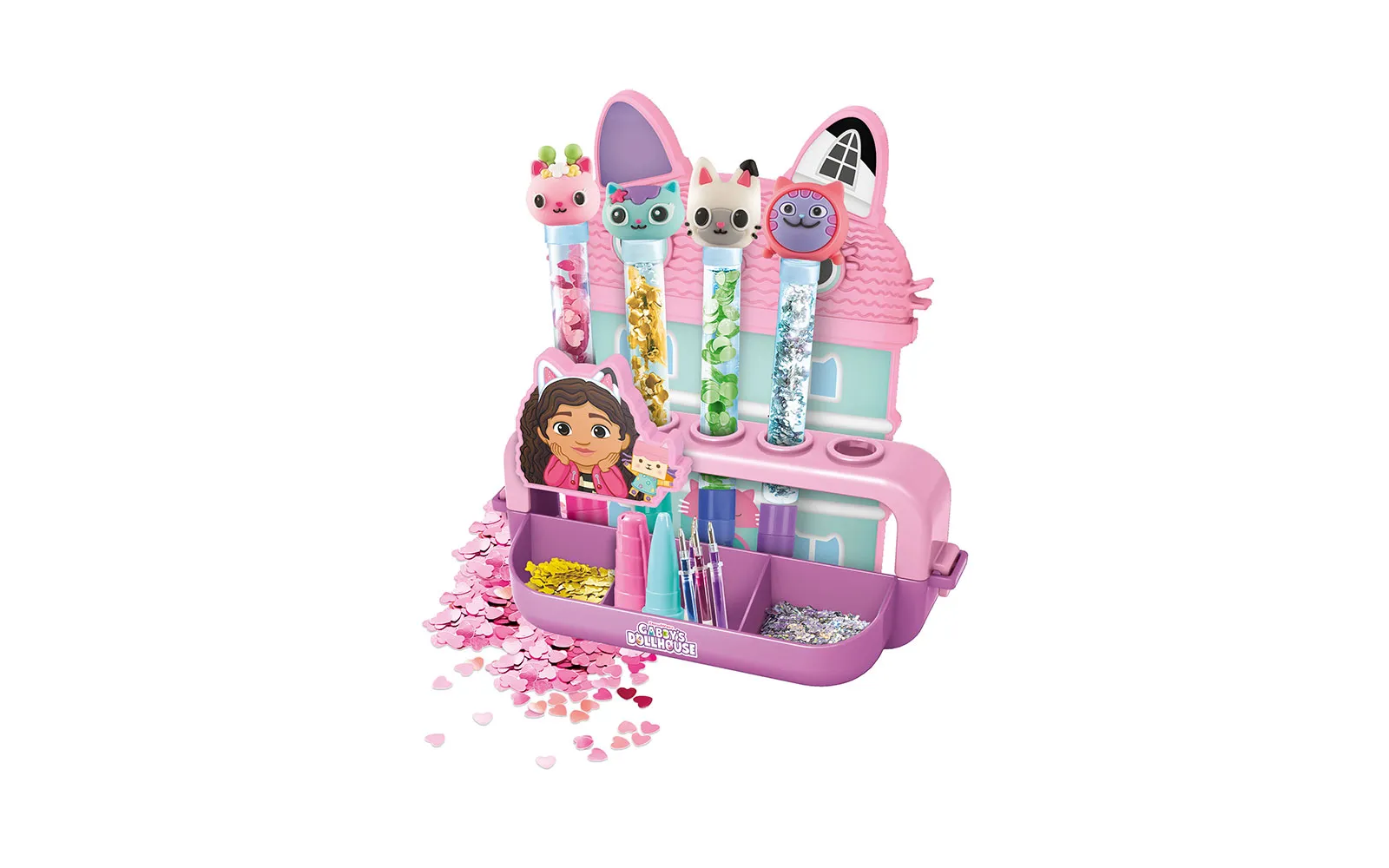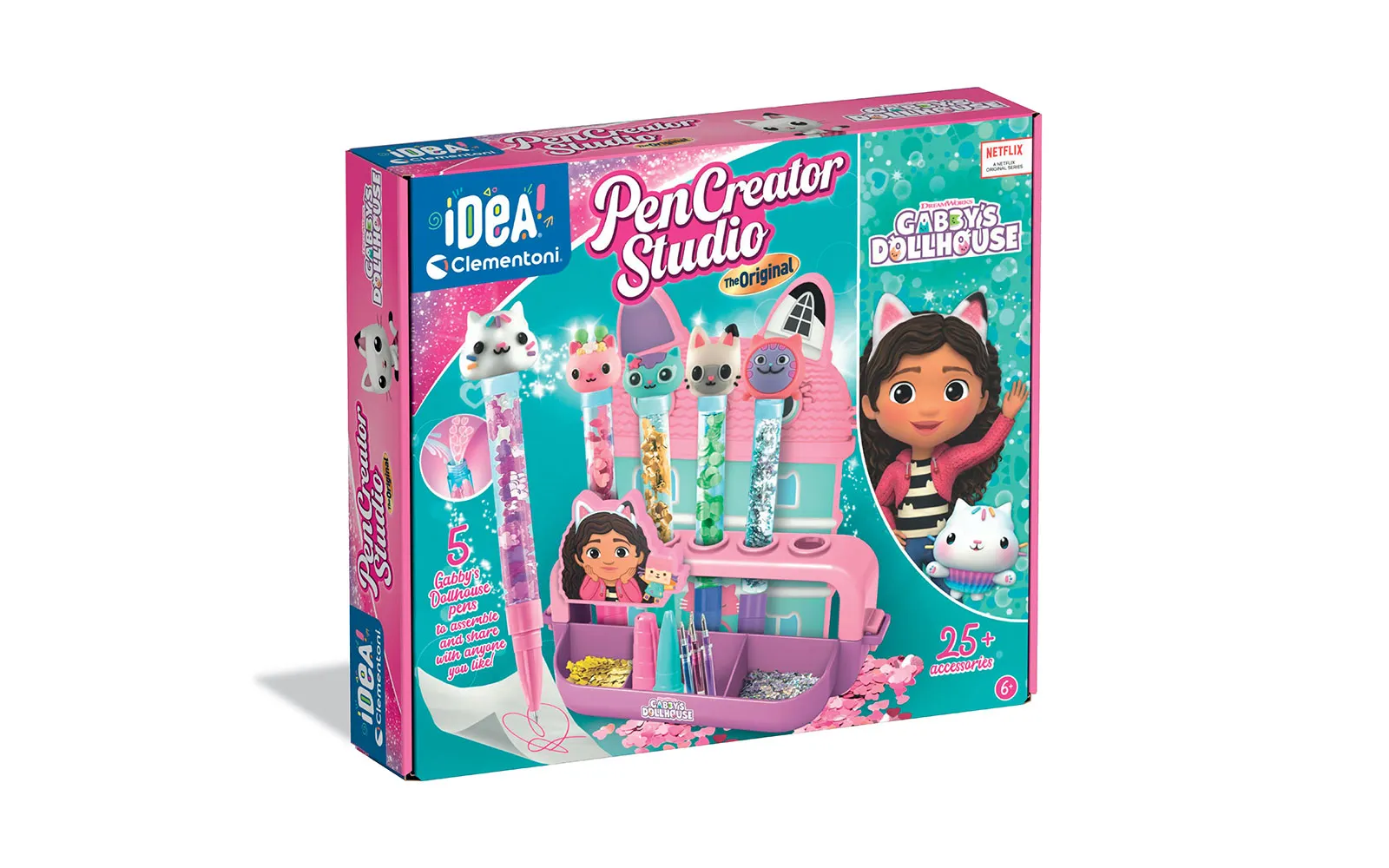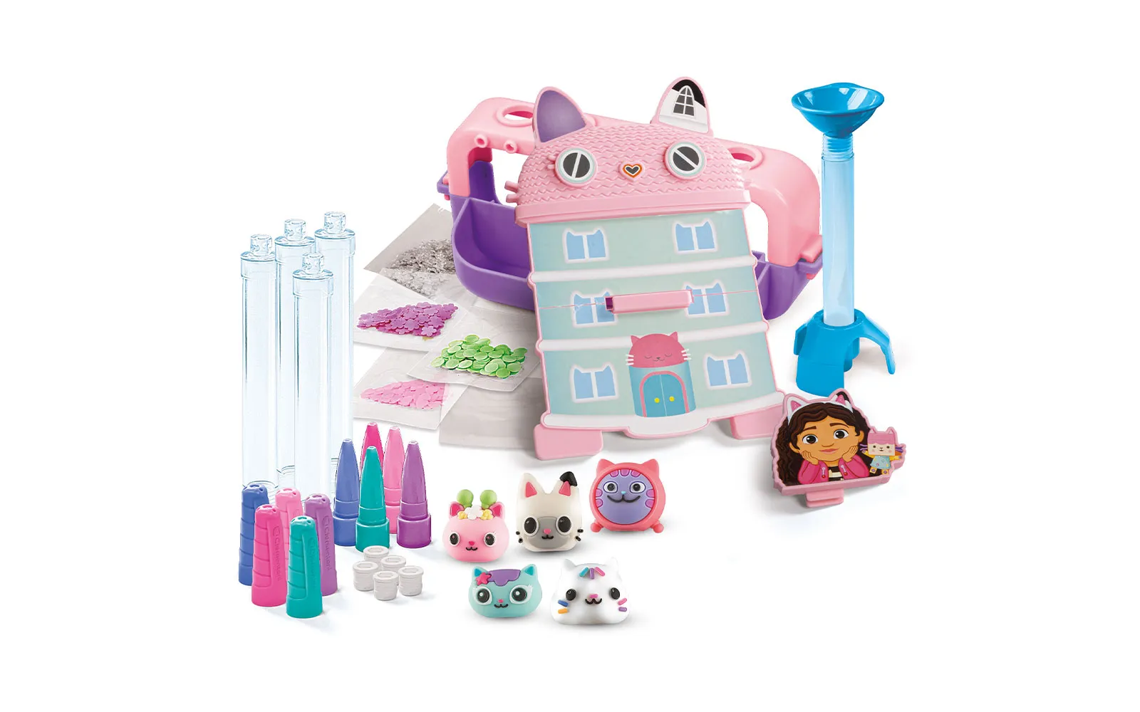 Create wonderful and unique pens with the brand new Pen Studio - Gabby's dollhouse! The perfect set for creating pens in the fairy-tale style of Gabby and her adorable kittens. The set includes a plastic stand and mold, 5 transparent pen cases, 5 white plugs and 5 caps with tips in matching colors, 5 ink cartridges in different colors, 5 bags of rainbow decorations in different shapes and colors, 5 rubber figures, stickers of Gabby’s Dollhouse, and illustrated instructions.