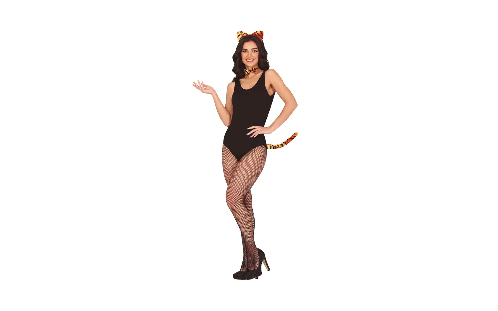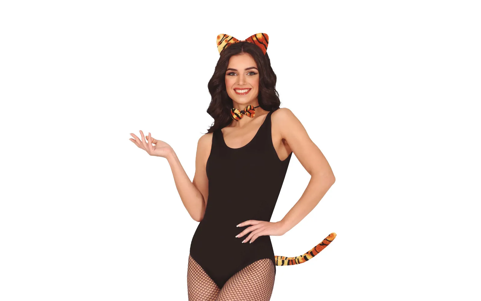 Carnival headband tiger + tail + butterfly.Turn into a wild cat with this playful set! It includes a headband with ears in a tiger pattern, a matching bow for around the neck, and a long tail. The perfect addition to a cat costume for carnivals, themed parties, or stage performances. The set is intended for adults and is sure to attract attention!