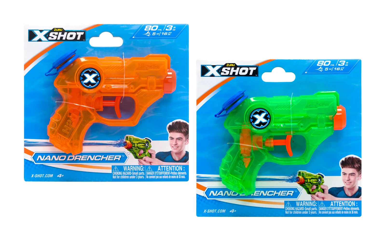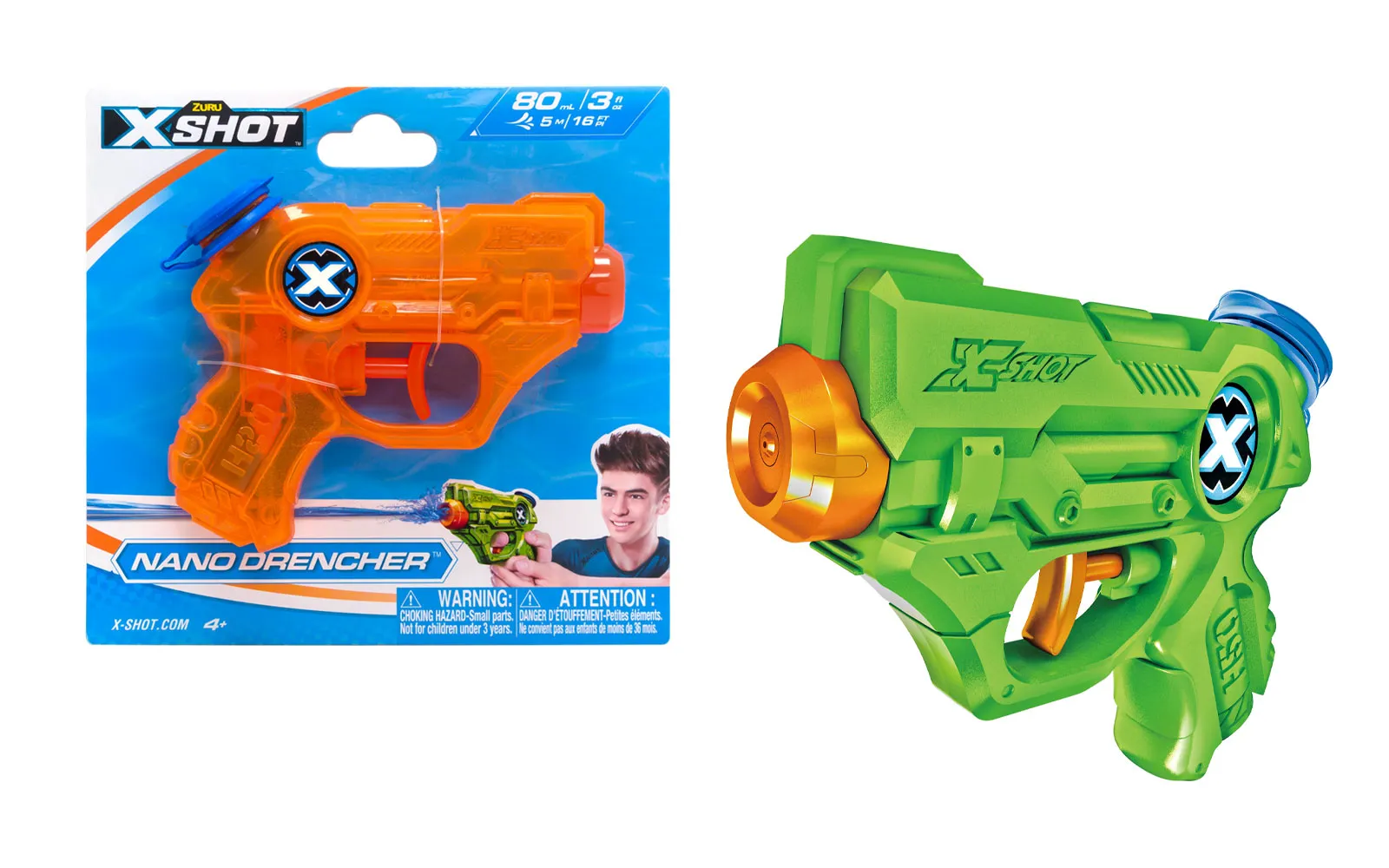 The Nano Drencher water gun, X-Shot, from the renowned brand Zuru. The water gun is 13 centimeters long with a capacity of 80 ml, and refilling it is easy and fun - open the cap, dip it in water, close the cap, and you're ready for a water fight - all in just one second! The water jets can reach up to 5 meters!