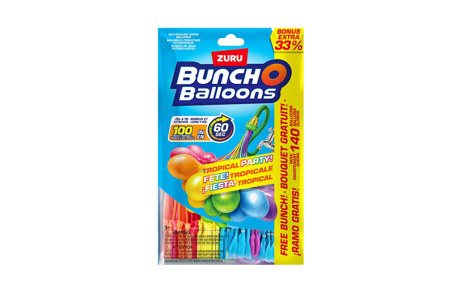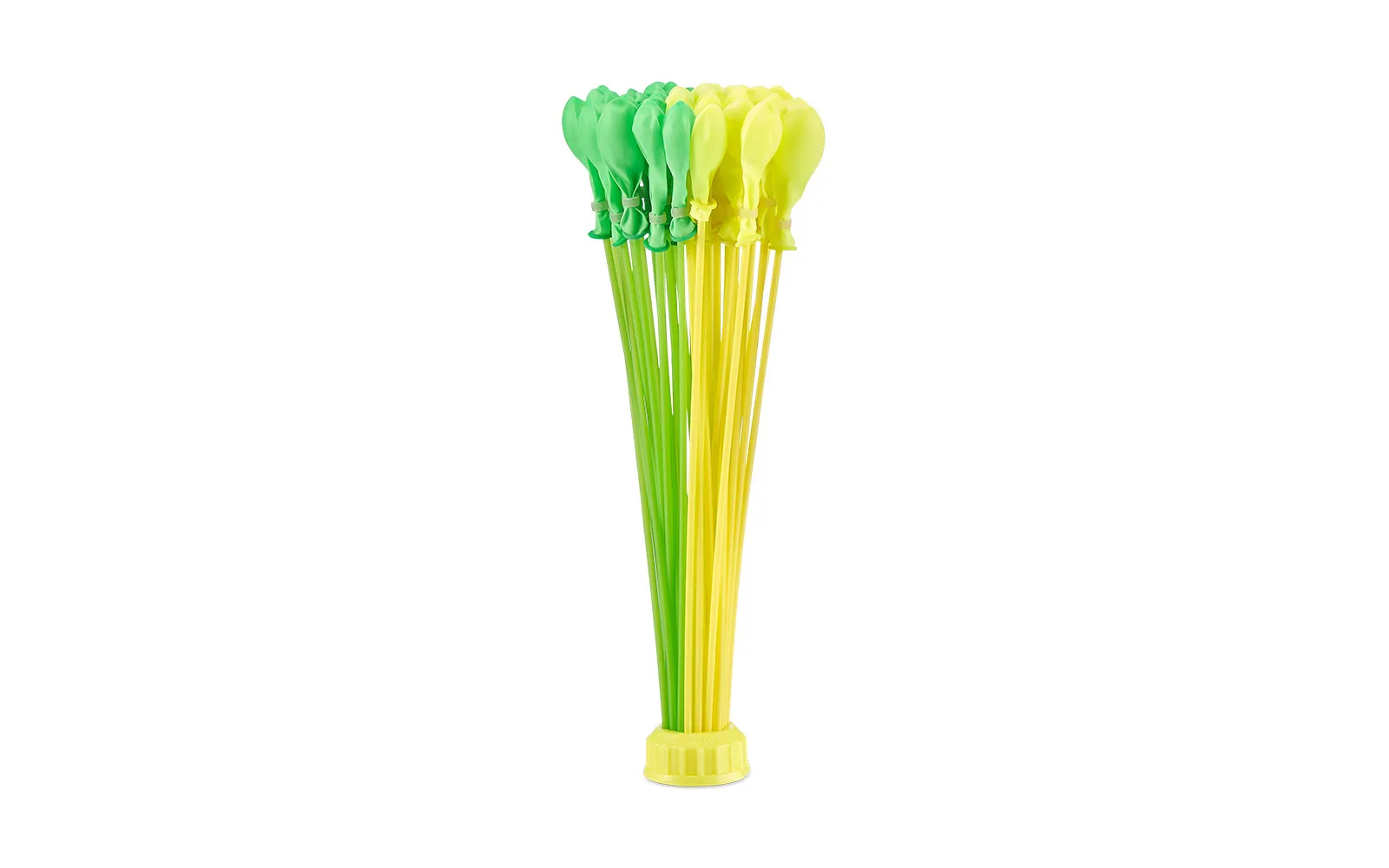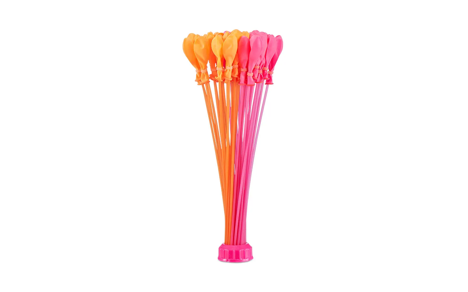 Fill and tie 100 water balloons + 40 pieces free in less than 60 seconds with these sensational self-tying water balloons! The Bunch O Balloons Tropical set contains three bunches of water balloons of different colors, which, when filled with water, tie themselves. There are about 35 water balloons in each bunch.