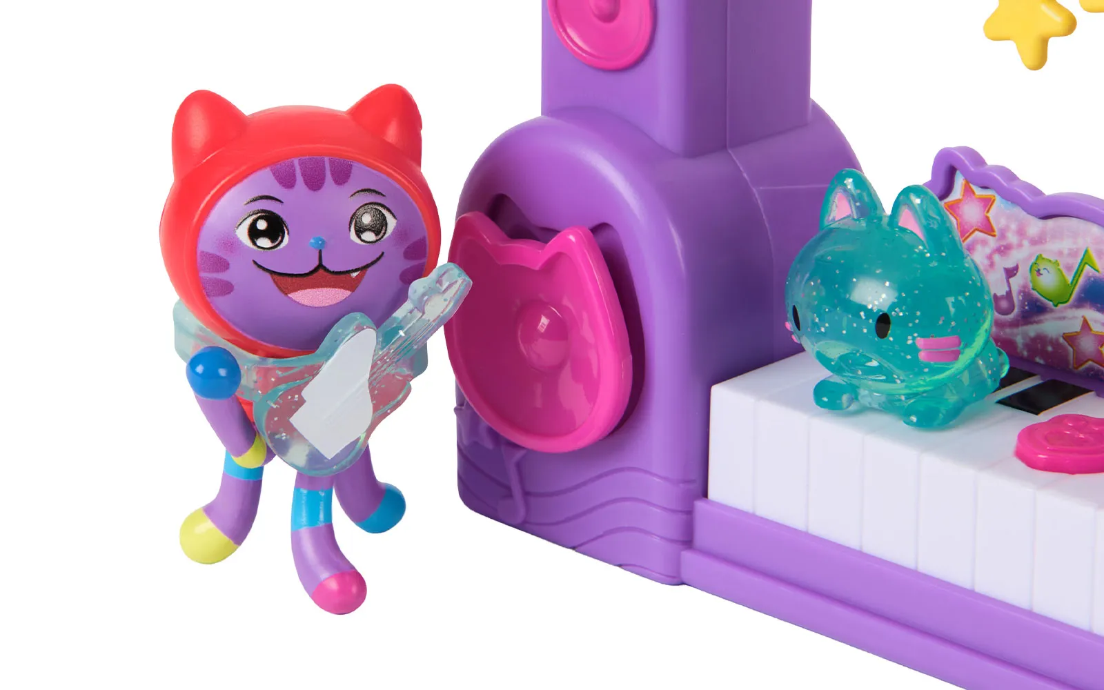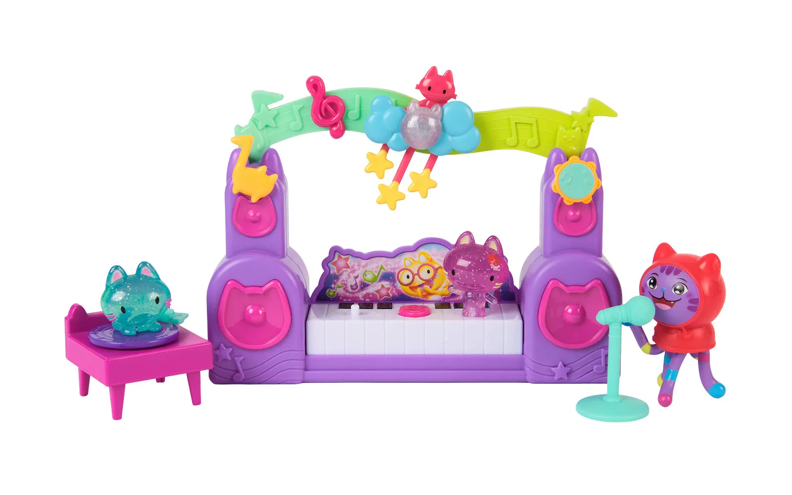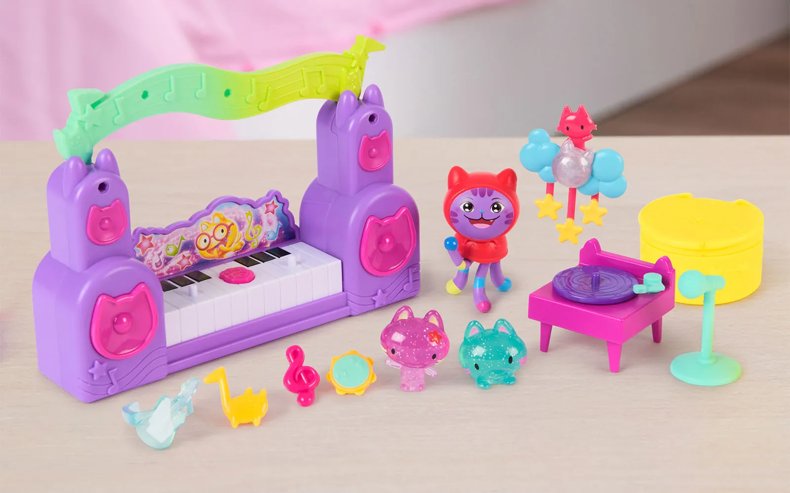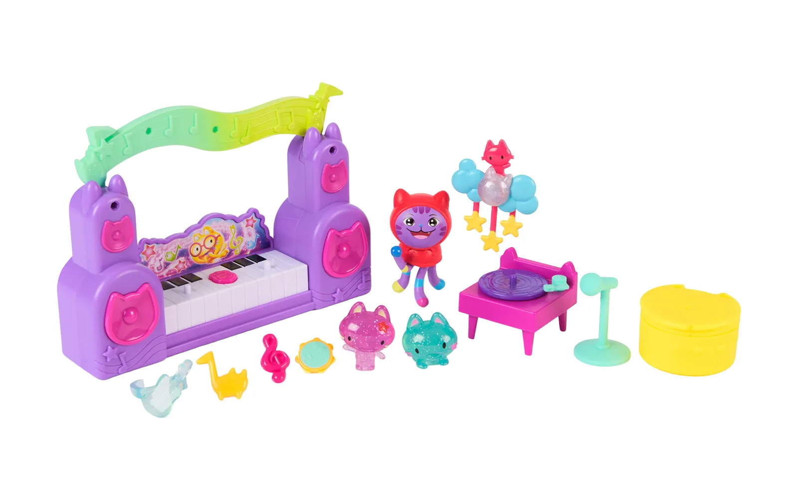 Movie music story, set, Gabby's dollhouse. The set includes everything for a real cat-taustic party! Additionally, equip your party room with new characters, or even your own Gabby house! The set includes a jukebox, guitar, gramophone and much more. These little kittens that are in the set, cause all sorts of trouble in the new film - they are real Partyanimals! Come alive with these funny new characters and DJ Catnip, Gabby's constant music lover.