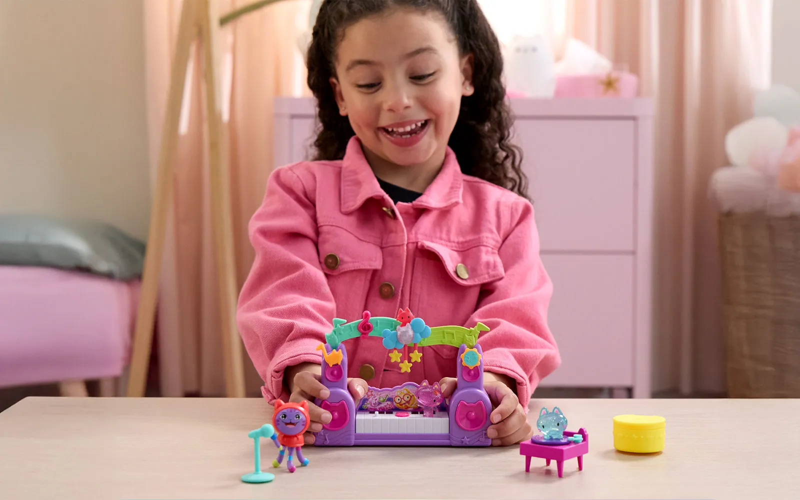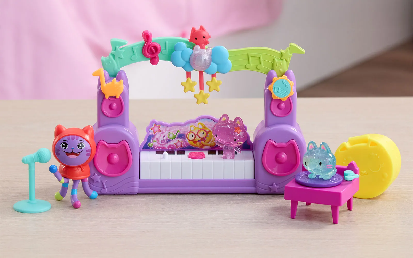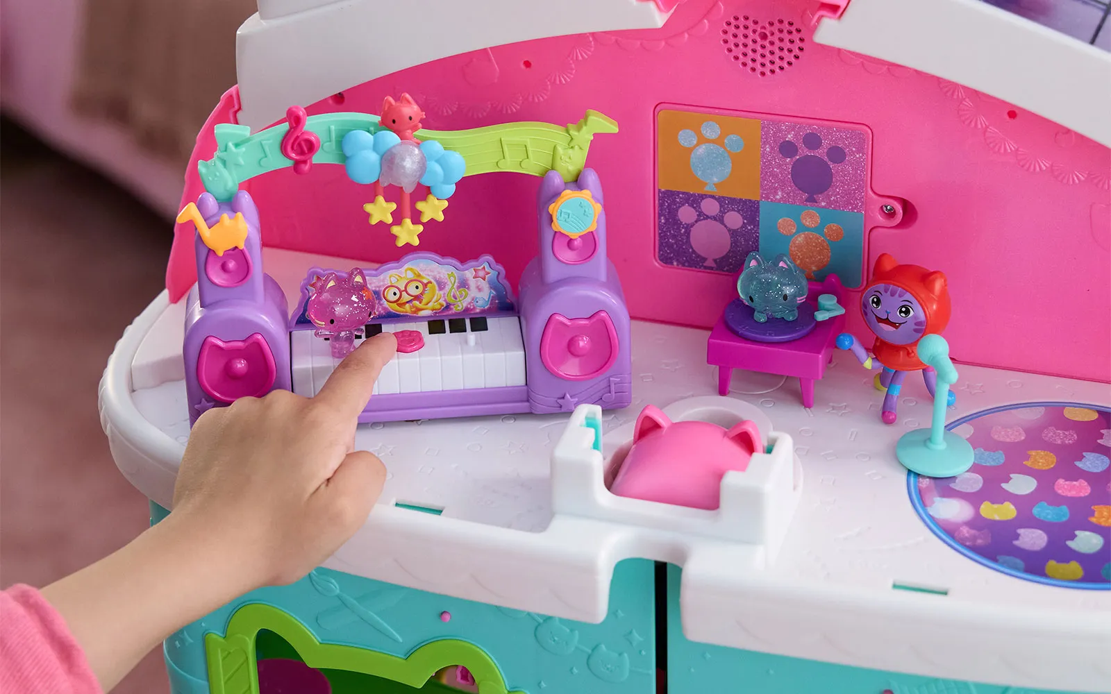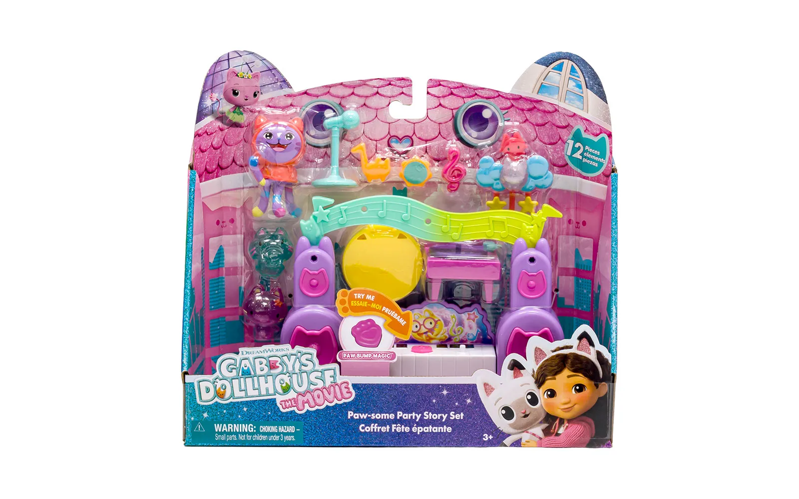 Movie music story, set, Gabby's dollhouse. The set includes everything for a real cat-taustic party! Additionally, equip your party room with new characters, or even your own Gabby house! The set includes a jukebox, guitar, gramophone and much more. These little kittens that are in the set, cause all sorts of trouble in the new film - they are real Partyanimals! Come alive with these funny new characters and DJ Catnip, Gabby's constant music lover.
