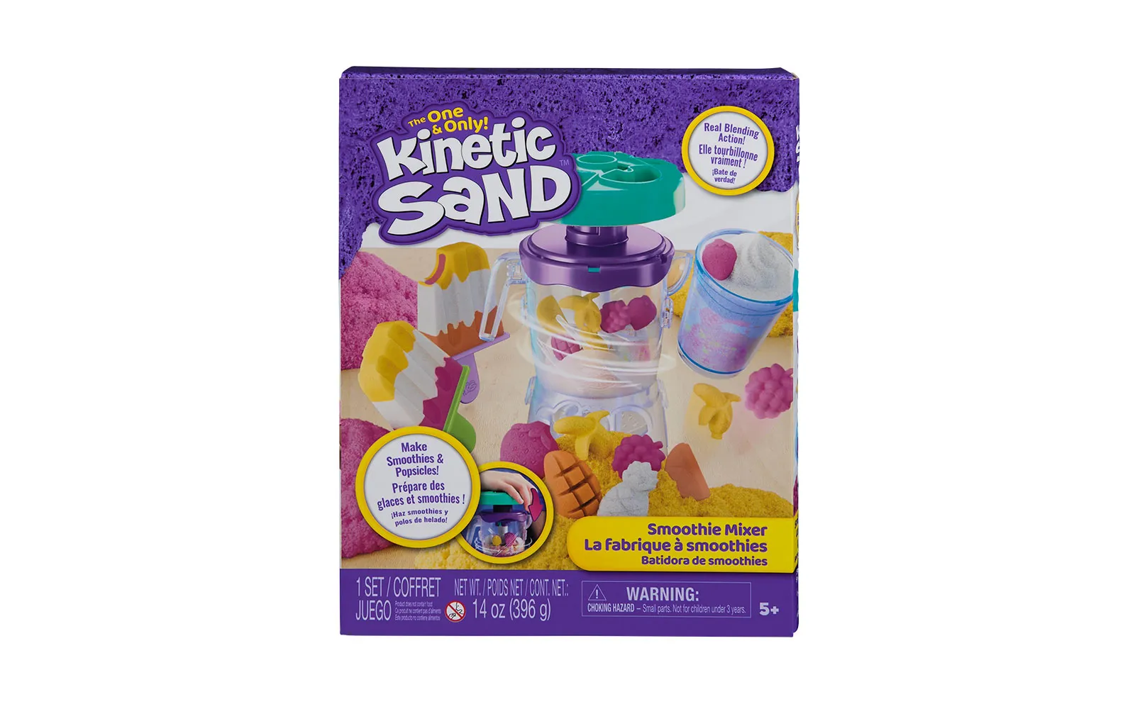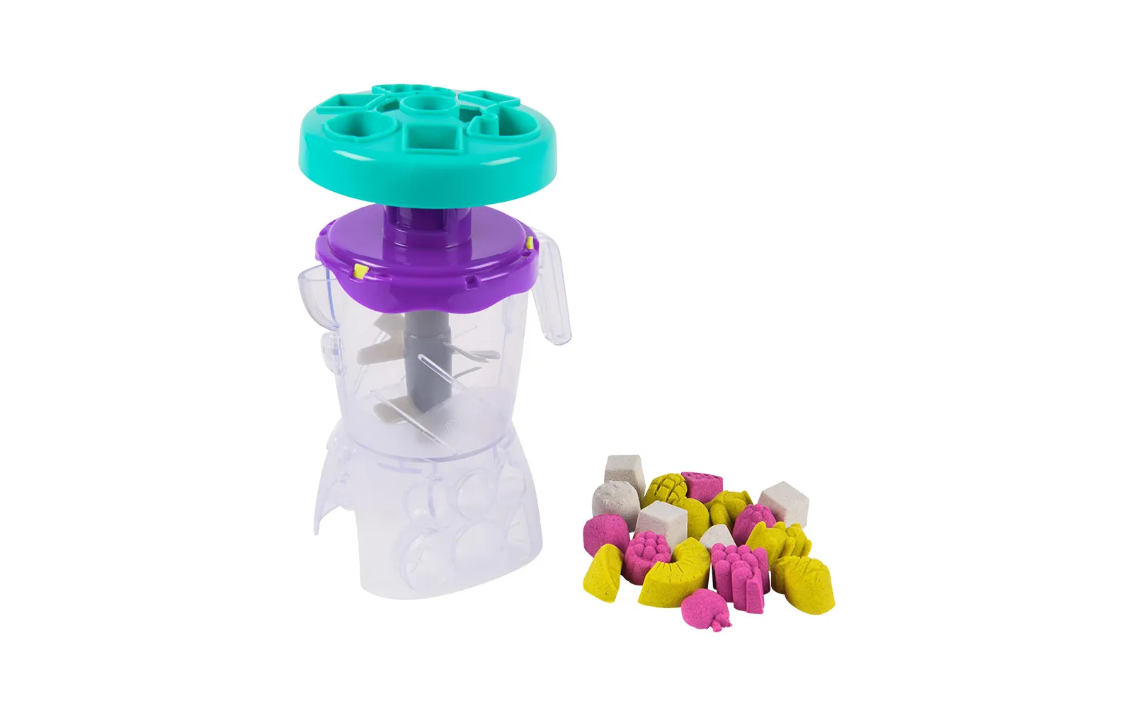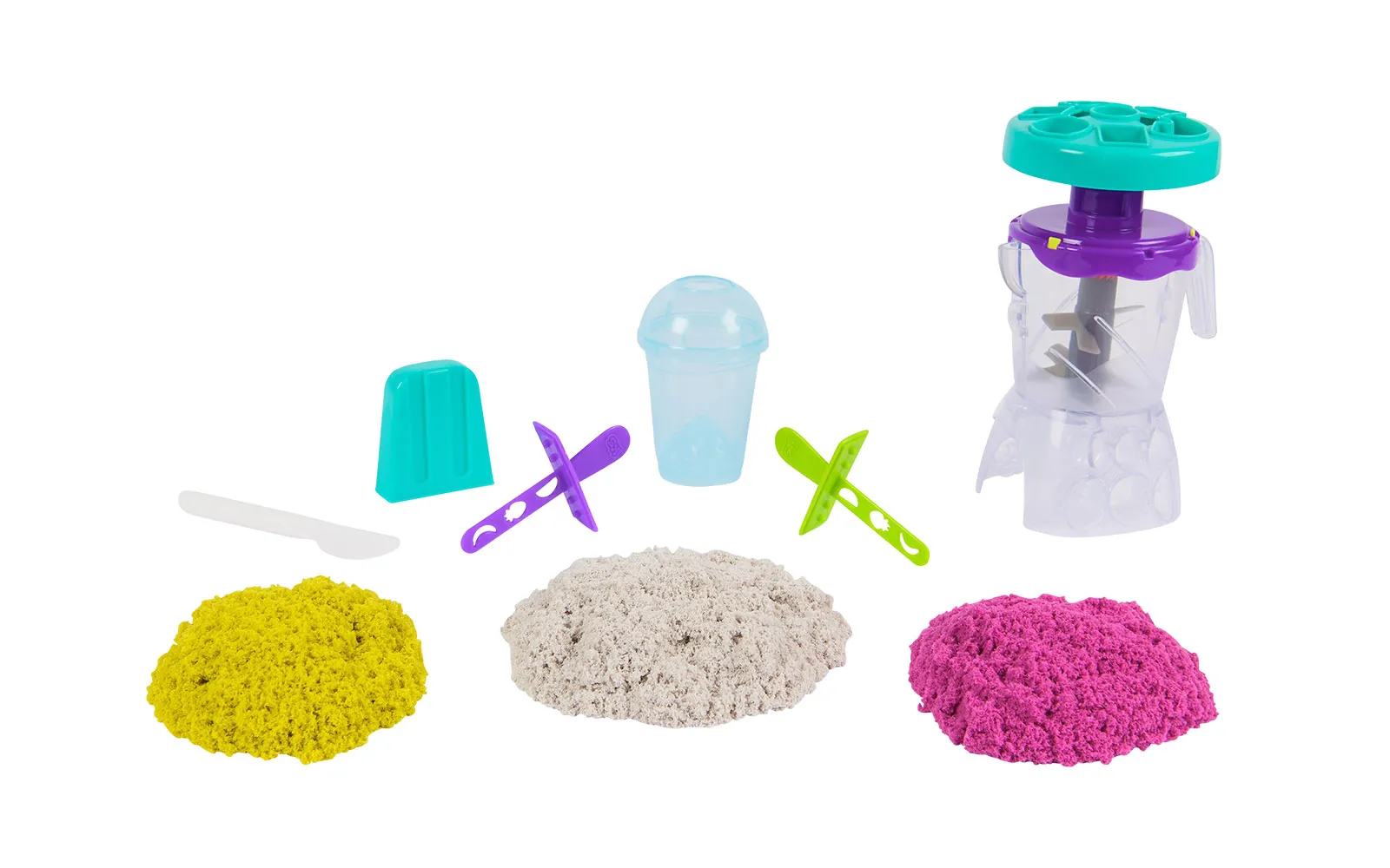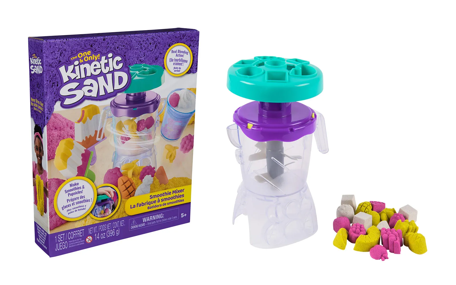 With the kinetic sand Smoothie Mixer, you can create real fruit art pieces! With this fun set, children can shape, stack, mix, slice, and squish their smoothies and popsicles, encouraging creativity and imagination. Kids will enjoy the game as they shape fruit and add-ons on the lid, drop ingredients into the cup and press for mixing, just like in a real smoothie blender. With the play sand (396 g), you can pour your smoothie creations into a serving cup or apply the sand in a popsicle mold for a beautiful artwork. Kinetic sand aids in the development of fine motor skills and sensory abilities and is suitable for individual or group play as it promotes social interaction. The set includes: 396 g of kinetic sand, 1 mixer cup, 1 mixer lid, 1 smoothie cup, 1 cup lid, 1 straw, 1 mold, and 2 popsicle sticks.