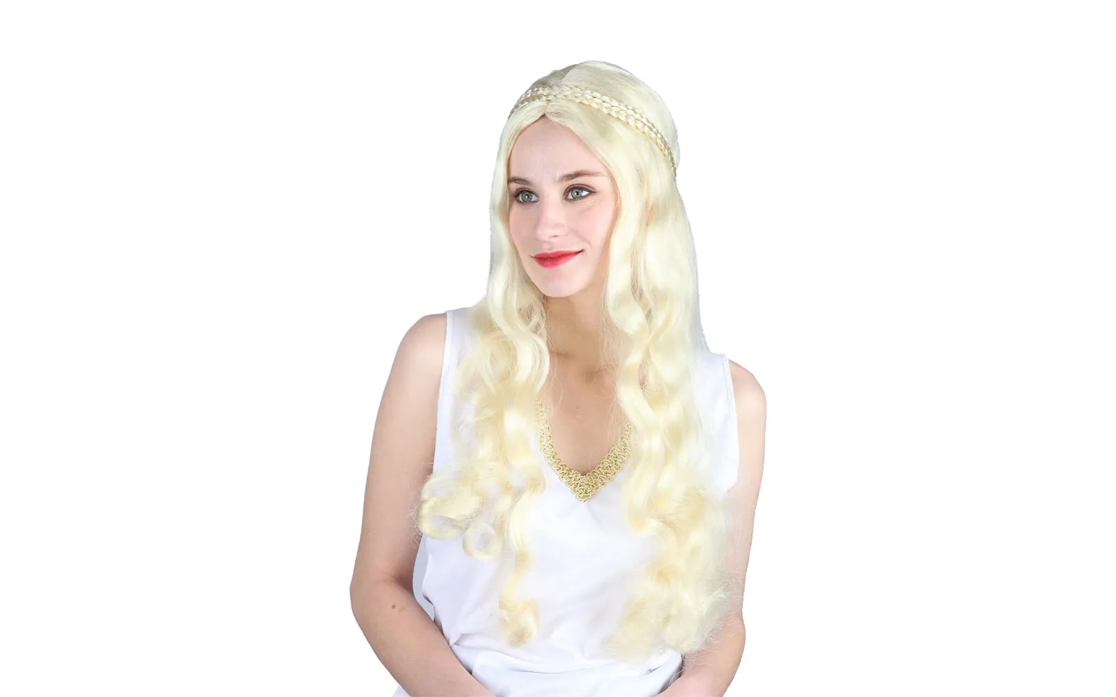 A goddess-style wig in light blonde color that will add a divine touch to your costume. Made from high-quality synthetic fibers, soft to touch and easy to style. Ideal for costume parties, themed events or theater performances.