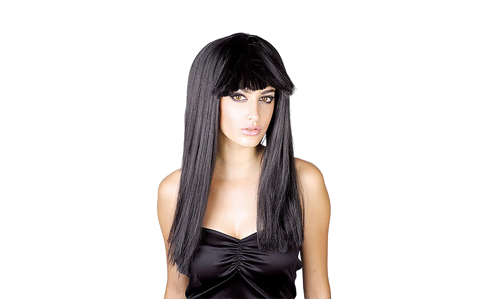 An elegant black Cleopatra-style wig with a classic straight fringe and smooth strands. The perfect accessory to an Egyptian costume or as a glamorous detail for themed parties, carnival or theatrical performances. The wig is comfortable and easy to wear.