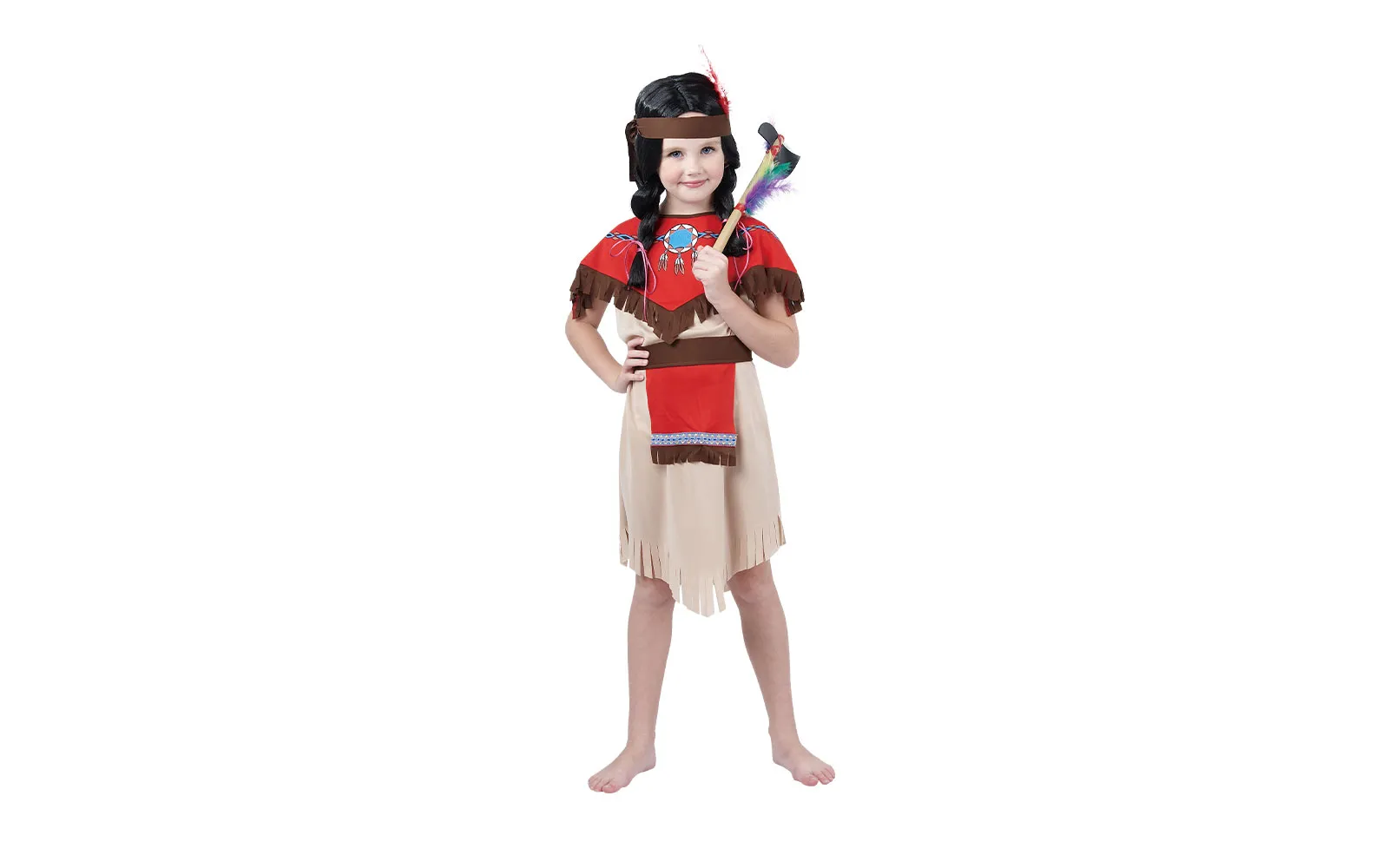 A colorful Native American costume with characteristic patterns, fringes, and ribbons. The set includes a dress, a belt, and a headband. The set does not include a wig and an axe. Perfect for carnival, theme parties, or role-play. It encourages imagination and exploration of new worlds through play.