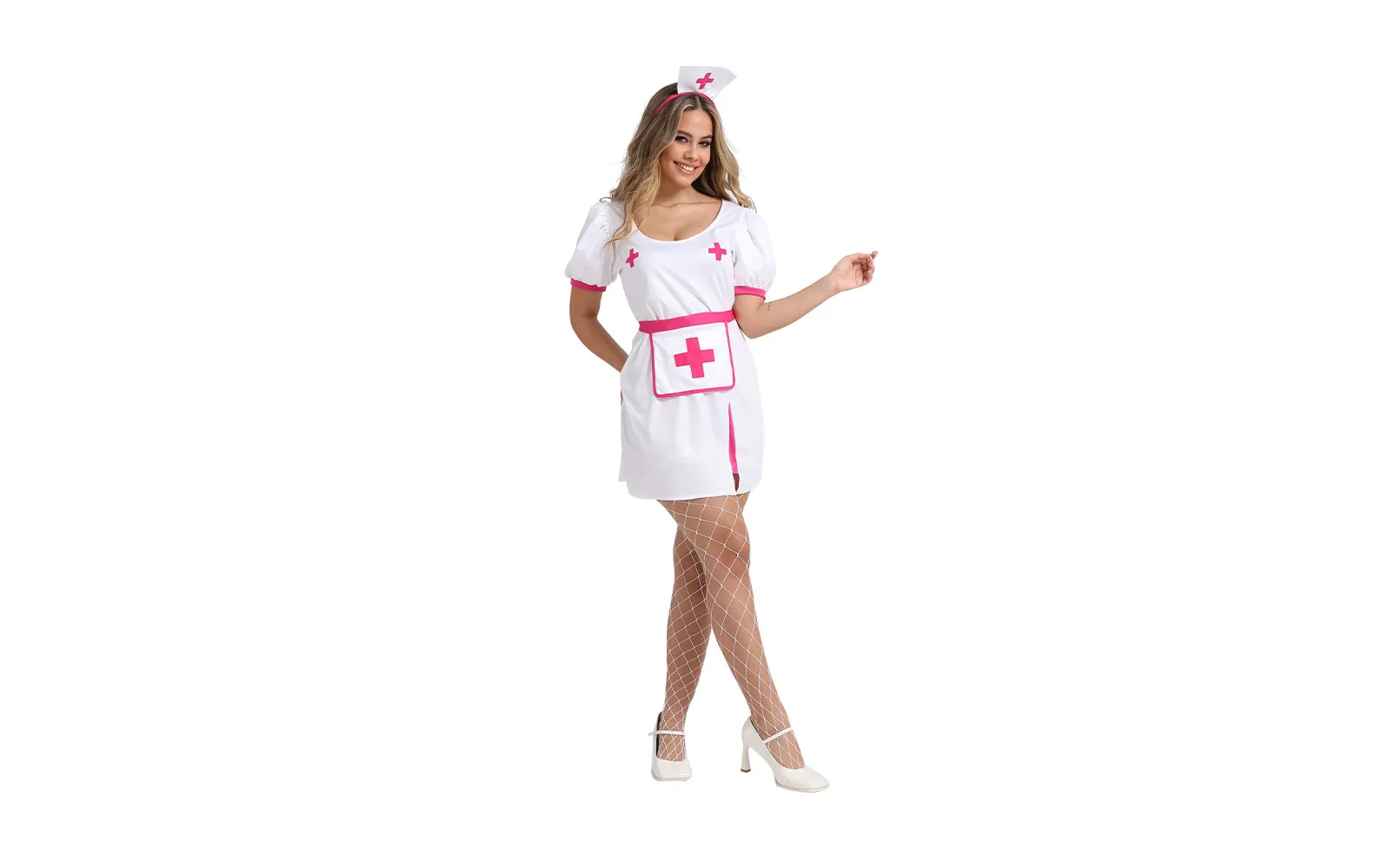A classic adult nurse costume, which includes an elegant dress with distinctive details, such as a cap with a pink cross. Suitable for carnival parties, theme nights, or role play games.