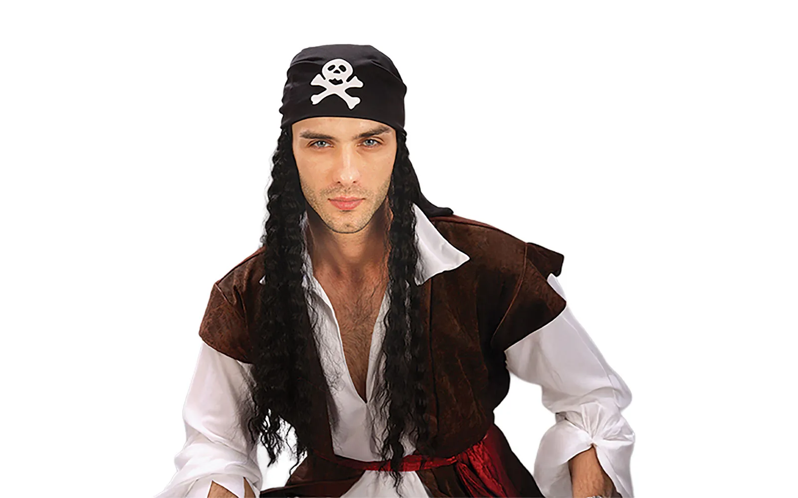 Complete your pirate look with this attractive wig! The dark, curly hairstyle with a bandana will add real buccaneer charisma to your costume. Comfortable to wear and ideal for carnival parties or themed events.