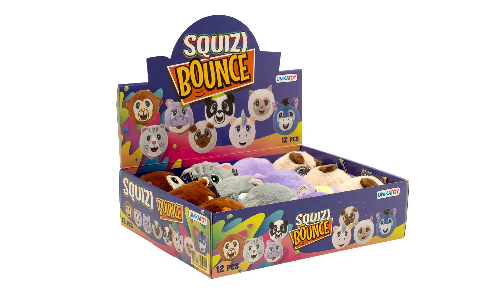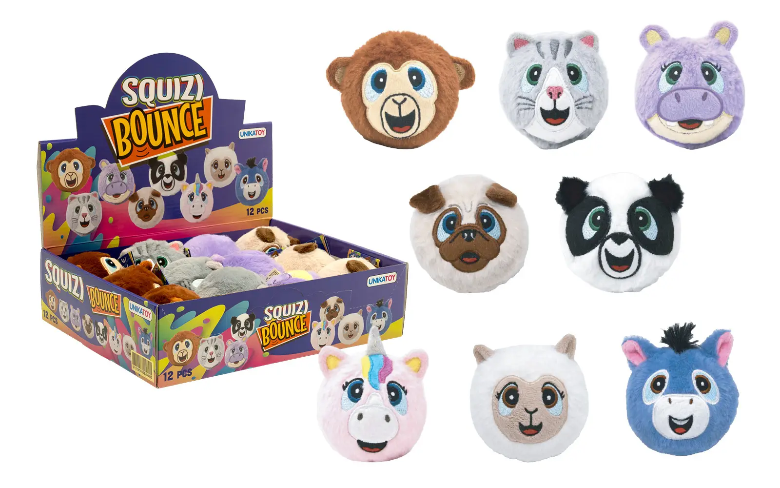 Bounce plush ball, 7 cm, Squizi, Unikatoy. Choose your ball motif and play with friends. Available in the styles of Charlie, Trish, Doug, Petunia, Dazzle, Meimei, Hughie, and Fluffy.
